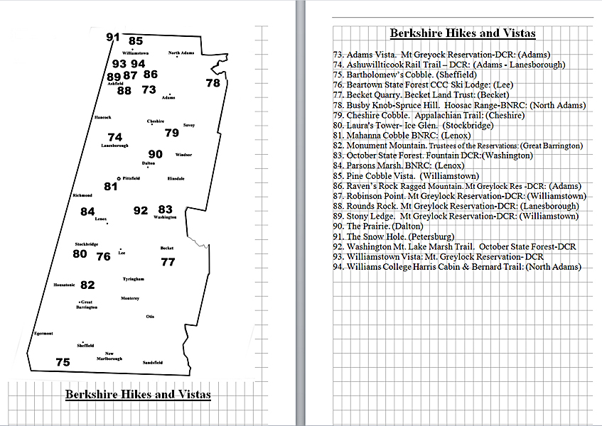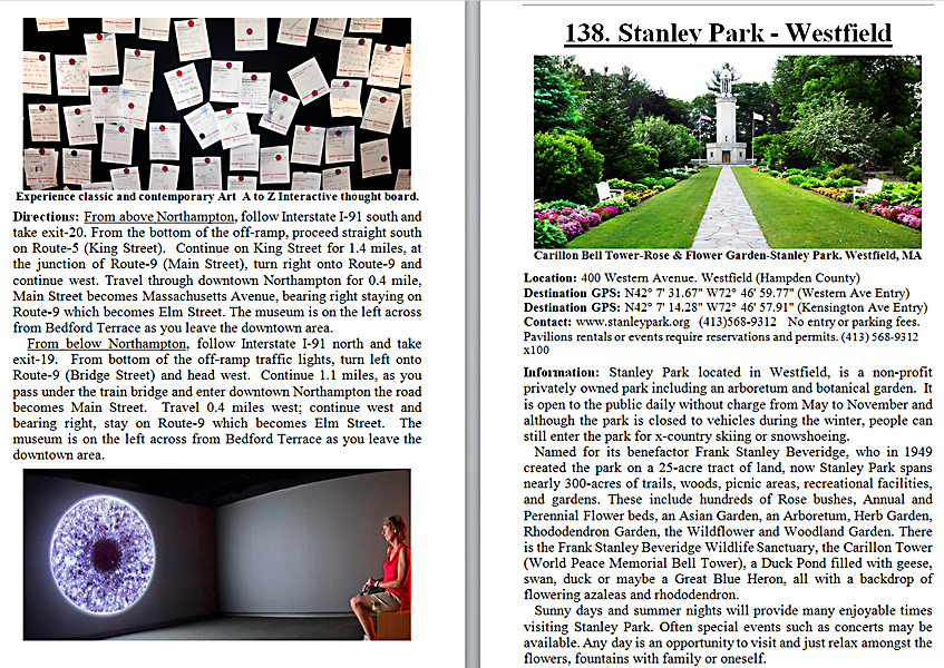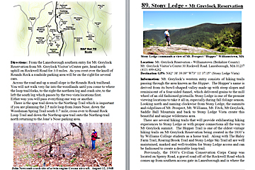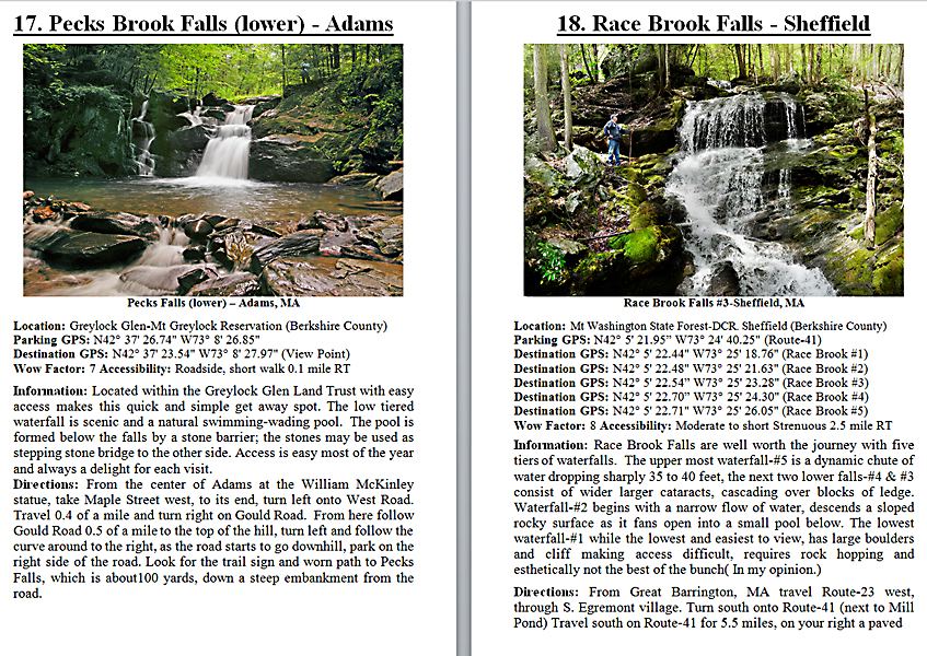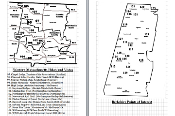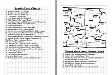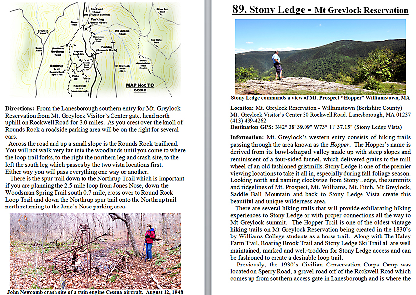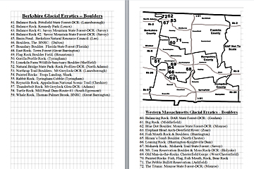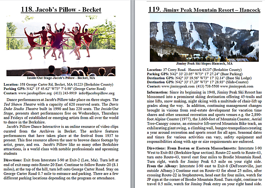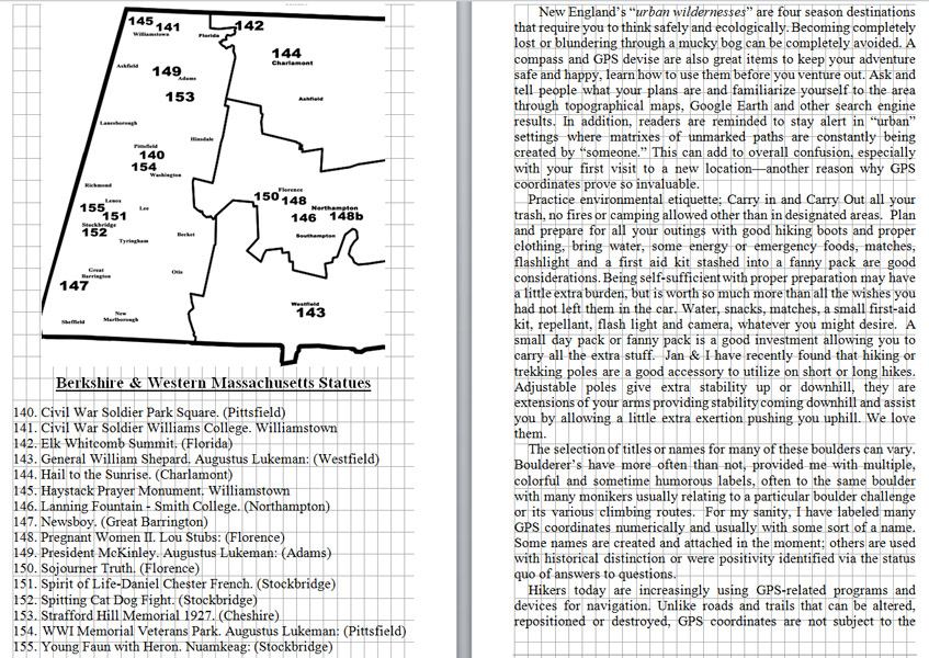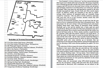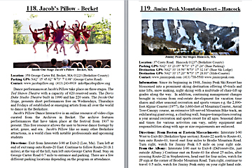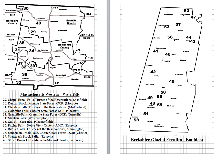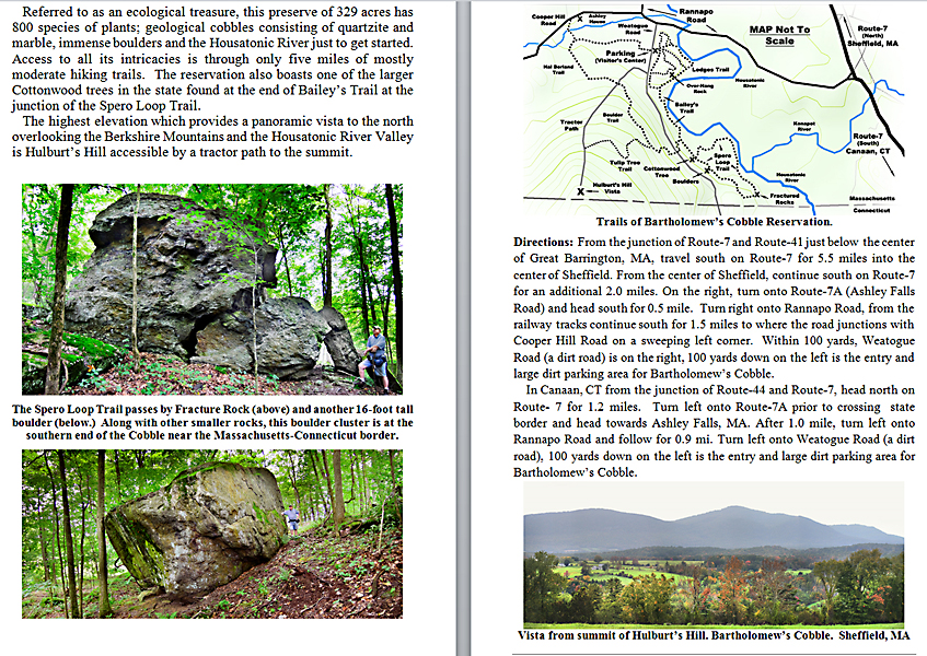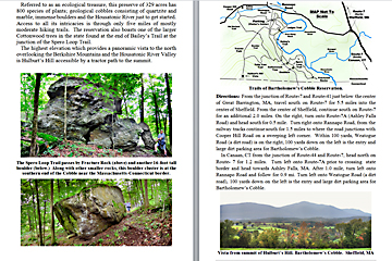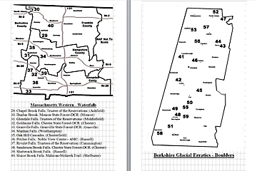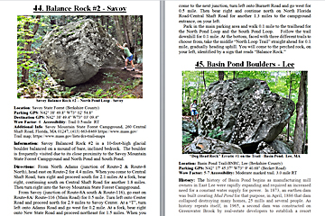 Look Inside The Book (Samples of various pages - click to enlarge) Table of Contents for Berkshire Destinations Waterfalls - Boulders - Hikes - Points of Interest - Statues Total of 348 pages, 155 Chapters, arranged alphabetically within each section. |