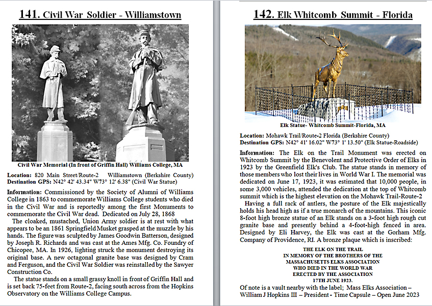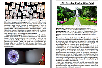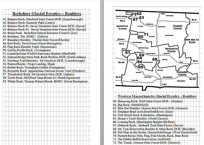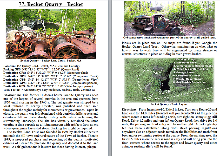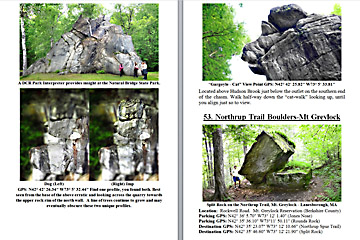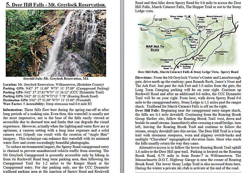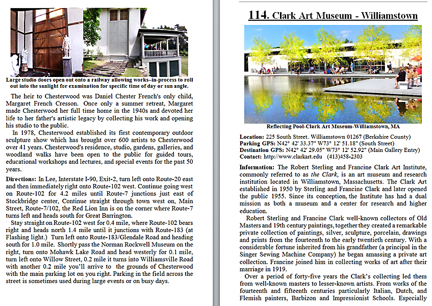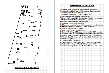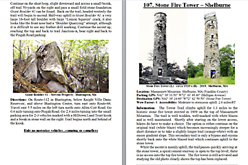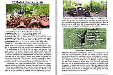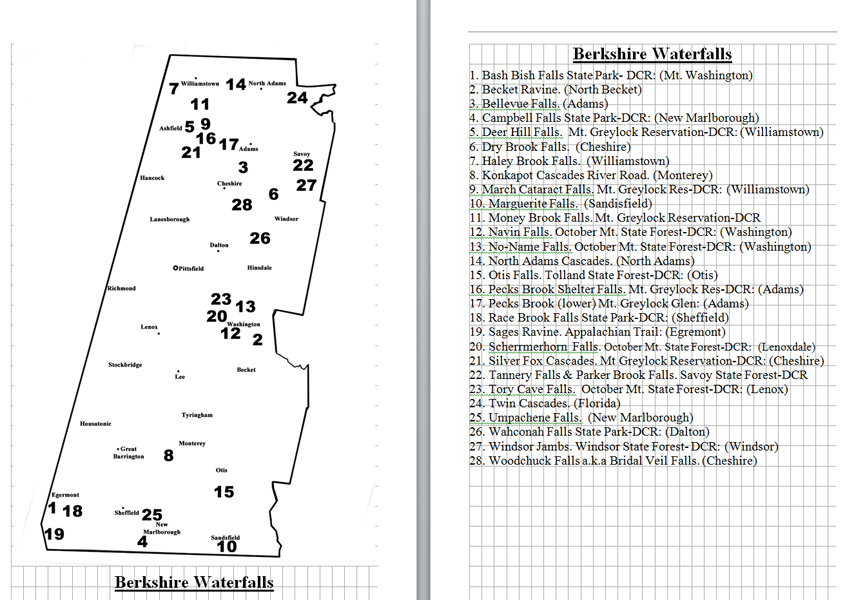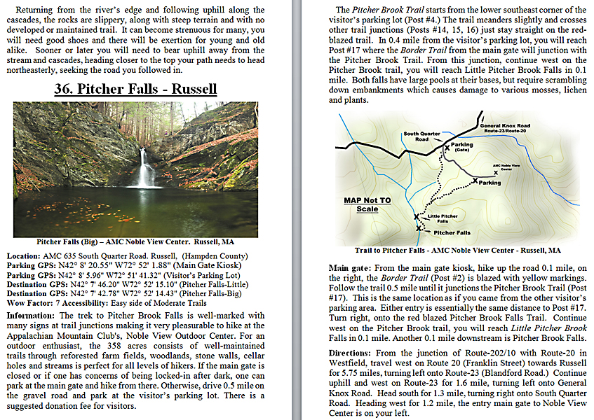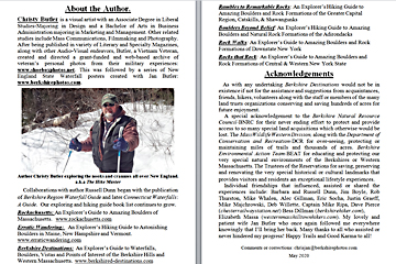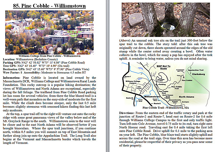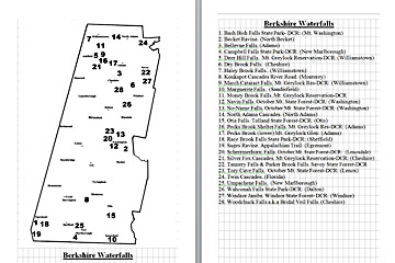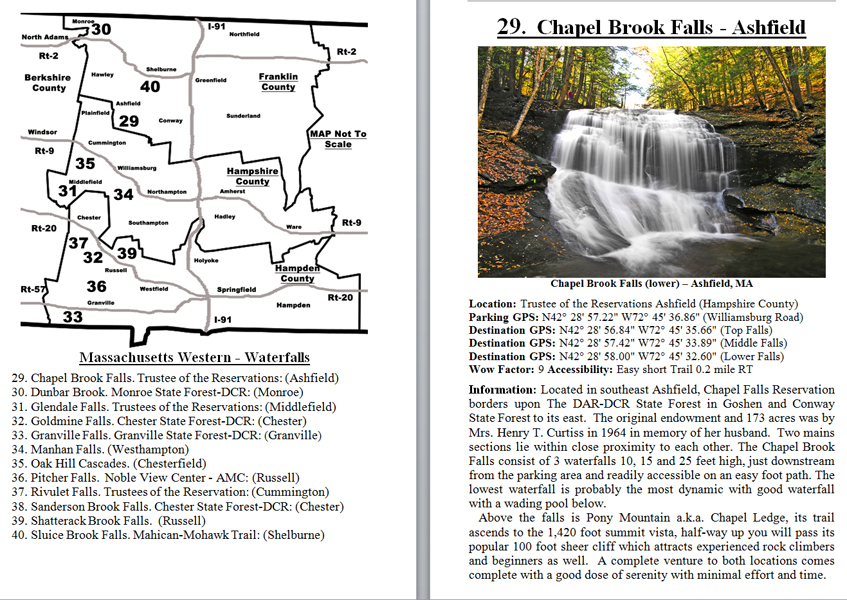 Look Inside The Book (Samples of various pages - click to enlarge) Table of Contents for Berkshire Destinations Waterfalls - Boulders - Hikes - Points of Interest - Statues Total of 348 pages, 155 Chapters, arranged alphabetically within each section. |